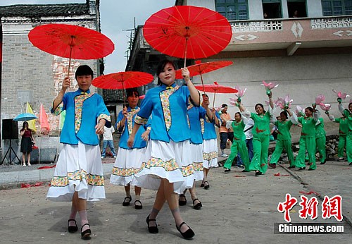 7月2日,是广西桂林市灵川县江头村具有千年历史的传统习俗节日——姑娘节,这天村里举行抬仙姑花桥、吹铜鼓、抬八卦、莲花舞等民俗文艺专场汇演,年轻的姑娘们穿上节日盛装,载歌载舞,以舞会友,以歌传情,吸引了众多中外游客。中新社发 唐梦宪 摄