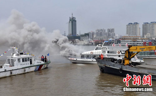 7月5日,一场大规模水上反恐、消防、救生联合演习在中朝边界辽宁省丹东市鸭绿江上举行。图为演习现场,“恐怖分子”点燃汽油致使船只失火冒烟。中新社发 宋太盛 摄