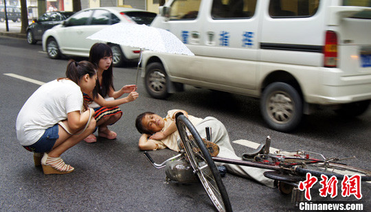 7月8日上午11时,西安含光北路,西安体育学院门口,一位骑自行车的老者突然全身抽搐,连人带车倒在了马路中间,老人随即昏迷了过去。由于该路段过往车辆很多,给老人安全带来了更大的危险!可路边的很多行人只是驻足观看,却没有人上前提供帮助,而车辆也都从老人身边绕道开过。