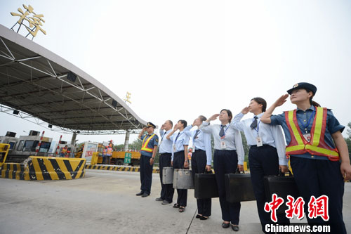 图为宁扬一级公路上的蒋王收费站15日早上8时整准时停止收费,拆除。收费站工作人员收起工作牌、整理好着装,走出了岗亭敬礼惜别。孟德龙 摄