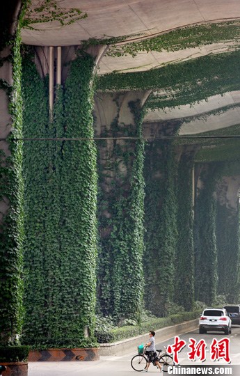 炎炎夏日,江苏南京虎踞北路高架桥的桥墩上爬满了“爬山虎”,不仅给钢筋水泥增添了生机,同时也给城市增添了不少凉意。
