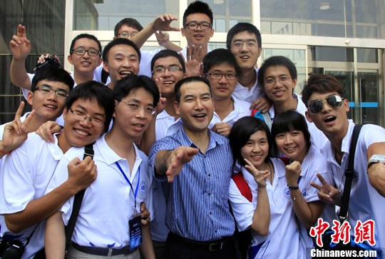 7月16日,台湾大学生航空航天夏令营参观北京航天城,在中国航天员科研训练中心与航天英雄翟志刚合影留念。中新社发 孙自法 摄