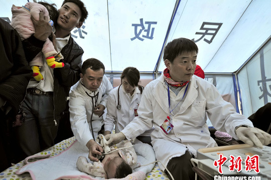 7月16日,来自北京安贞医院的小儿心脏专家吴江、李磊及超生诊断专家吴山在青海玉树曲马莱县巴干乡为村民义诊。中新社发 陆欣 摄