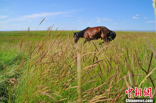 位于新疆哈密地区巴里坤县的巴里坤草原,是新疆三大草原之一。图为“深草”中觅食的骏马。马新龙 摄