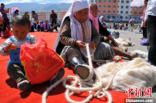 哈萨克族老太太面前放着羊毛,她在用羊毛拧绳子,这种绳子结实耐用。马新龙 摄