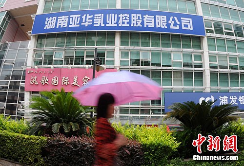 7月23日上午,湖南长沙部分超市的南山倍慧奶粉暂未下架。图为湖南长沙亚华乳业控股有限公司门前。杨华峰 摄