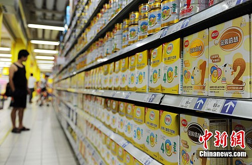 7月23日上午,湖南长沙部分超市的南山倍慧奶粉暂未下架。图为市民正在选购奶粉。杨华峰 摄