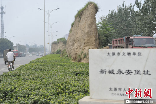 7月27日,在山西太原新城南大街路边的绿化带内,太原市文物保护单位“新城永安堡址”坐落在此。由于该遗址常年裸露在路边缺乏保护,已经逐渐风化。韦亮 摄