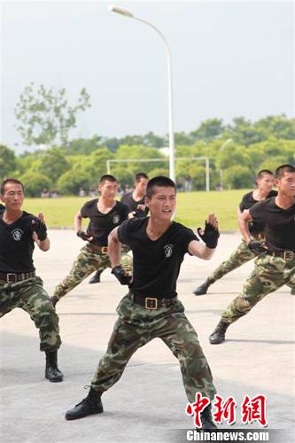 27日上午,三峡坝区举行“专业安全保卫力量集结暨比武会操演习”,600余名公安民警、武警战士和专业安保人员进行了擒拿拳、手枪精度射击等多个科目的比武。图为擒敌拳比武。刘良伟 摄