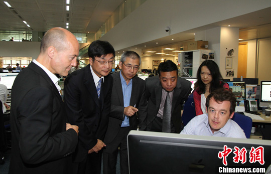图为在每日电讯集团数字部门总监爱德华·罗塞尔(左一)的陪同下,刘北宪一行参观了该报的新闻编辑平台。中新社发 李鹏 摄