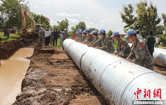 应瓦乌县政府请求,当地时间7月26日,中国赴南苏丹维和工程兵大队出动人员装备,成功修缮瓦乌县境内一条交通要道。图为工程兵在埋设涵管。中新社发 隋有华 摄