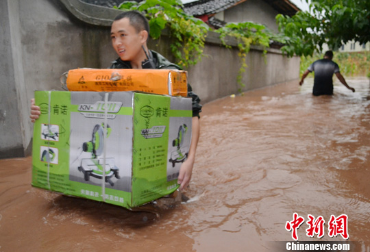 7月27日,四川洪雅境内突降暴雨,致城区部分地势低洼地带民房被淹,造成部分民众被困家中。消防官兵洪水中帮助民众转移物资。李赵 摄