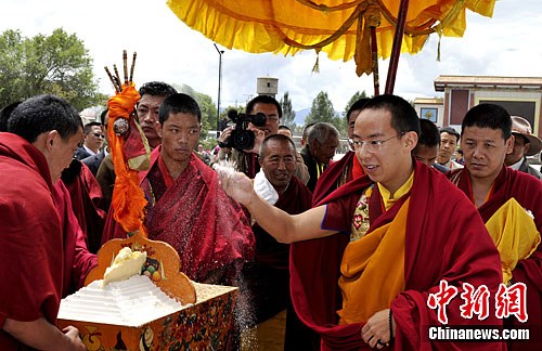 图为29日,班禅额尔德尼·确吉杰布抵达扎什伦布寺受到僧众欢迎。中新社发 李林 摄