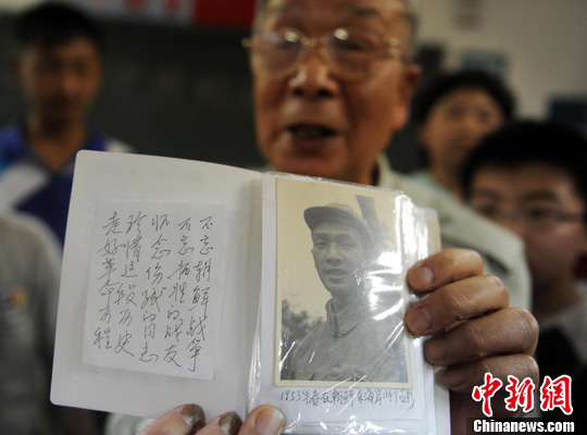 图为老兵展示自己59年前在朝鲜的留影和箴言。中新社发 张娅子 摄