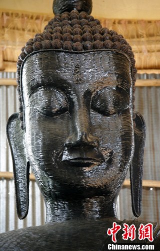 在云南瑞丽市雷允村,一尊高达数米的特制大佛吸引着游客的目光。据当地村民介绍,它是中缅两国边民用竹子,耗时两年编织出来的,用竹子编织大佛在当地也并不多见。中新社发 王艳龙 摄