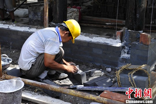 8月2日,一名工人正在切割砖块。北京市东城区北总布胡同的梁思成林徽因故居曾于2012年年初被“维修性拆除”,这一举动当时在社会上造成了极大反响。中新社发 崔楠 摄
