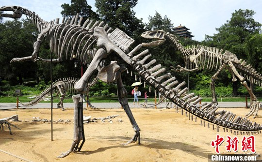 8月2日,正在北京景山公园举办的恐龙科普展上,巨大恐龙模型吸引中外游客参观。恐龙展展览的恐龙达到80多件,为历年最多。中新社发 张勤 摄