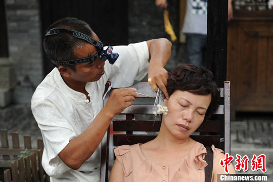 成都街头享受掏耳的老百姓。张浪 摄