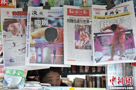 在北京时间8月7日的伦敦奥运会男子110米栏预赛中,被中国民众寄予厚望的刘翔因右脚伤势复发,在跨越第一栏时摔倒后,各媒体纷纷在头版刊发了刘翔奥运赛场摔倒的新闻报道。