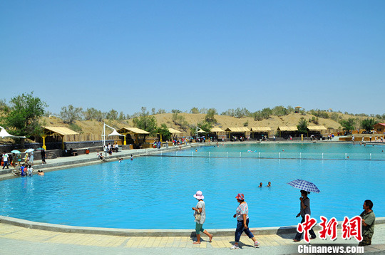 驼铃梦坡位于新疆石河子垦区150团场,地处古尔班通古特沙漠西南缘与绿洲的交接带,整个景区占地10.55平方公里。图为高温下,沙漠泳池让人享受难得清凉。马新龙 摄