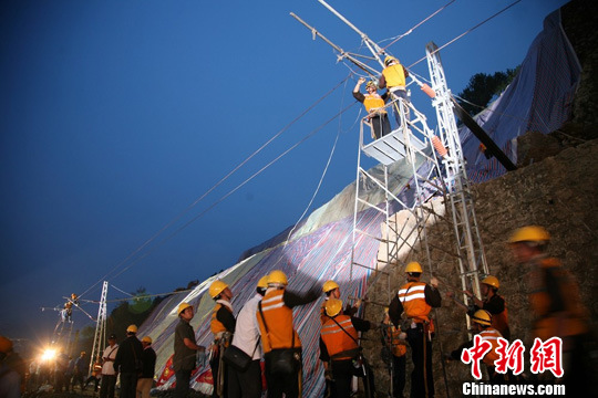 8月13日20时59分,经过西安铁路部门连续5天的昼夜奋战,西安铁路局管内宝成铁路朝天至军师庙间上行线路顺利抢通。至此,宝成铁路双线恢复正常行车。中新社发 杨晓东 摄