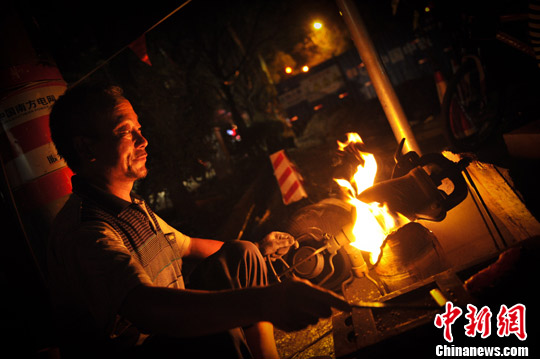 8月17日晚,在制作爆米花的郭广阳。中新社发 刘冉阳 摄