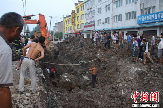 荆州市一处地下排水管道施工现场发生塌方,2名正在施工的工人被埋。吴建锋 摄
