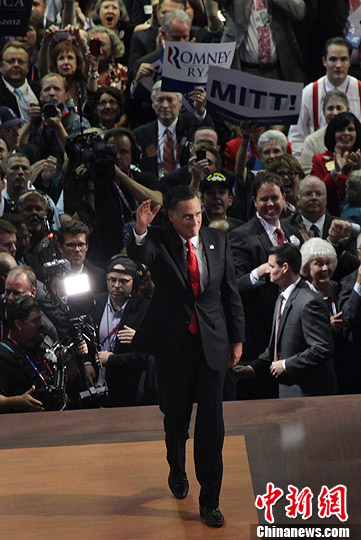 当地时间8月30日晚,罗姆尼在佛罗里达坦帕举行的共和党全国代表大会上发表演讲,宣布接受共和党的总统候选人提名,向谋求连任的总统奥巴马发起正式挑战。中新社发 李洋 摄