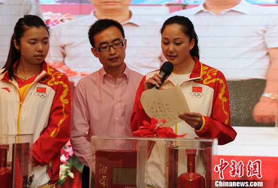 伦敦奥运会花样游泳集体项目银牌获得者孙文雁(图右)拆开存放在酒瓶内的心愿信封。杨华峰 摄