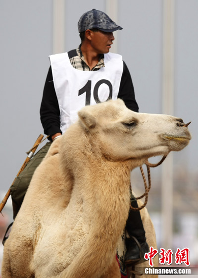8月31日,第二届鄂尔多斯国际那达慕大会的10000米赛驼比赛在内蒙古鄂尔多斯市伊金霍洛旗举行。中新社发 刘关关 摄