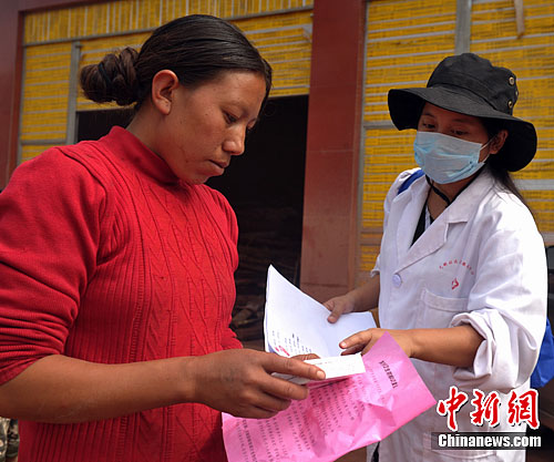 图为防疫人员正在向灾民发放药品和防疫宣传资料。中新社发 刘忠俊 摄