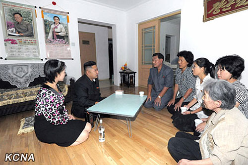 9月4日,朝中社公布照片,朝鲜劳动党第一书记、朝鲜国防委员会第一委员长、朝鲜人民军最高司令官金正恩访问住进仓田街新房的居民家庭,并席地而坐与民众交谈。