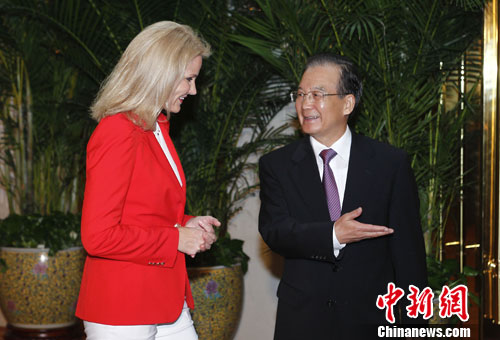 9月11日,中国国务院总理温家宝在天津会见出席2012年夏季达沃斯论坛的丹麦首相托宁-施密特。中新社发 杜洋 摄