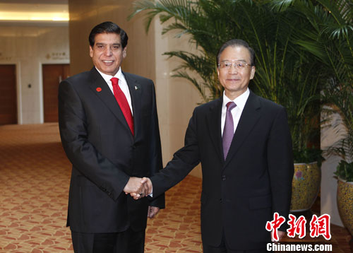 9月11日,中国国务院总理温家宝在天津会见出席2012年夏季达沃斯论坛的巴基斯坦总理阿什拉夫。中新社发 杜洋 摄