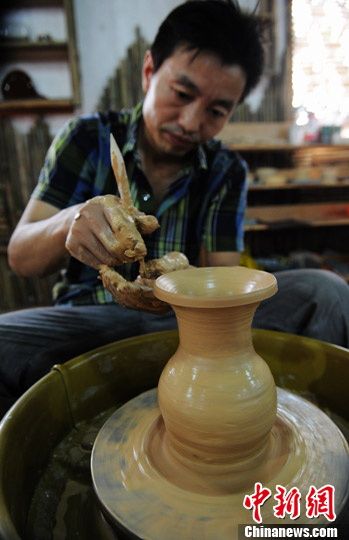 9月11日,中国最大的陶吧“欢乐谷”在湖南望城铜官国际陶艺村建成迎客。图为陶艺师正在“欢乐谷”陶吧中制作陶器。杨华峰 摄