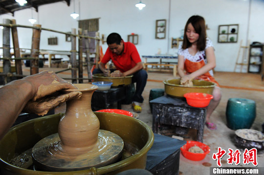 9月11日,市民正在“欢乐谷”陶吧中学习制作陶器。杨华峰 摄