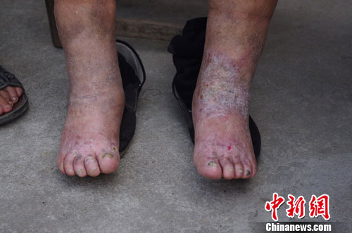 74年前刘诗成老人的腿遭遇日军施放的芥子气毒害,至今依然肿胀。王昊阳 摄