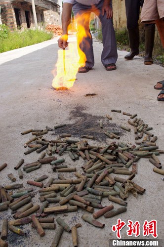 七十余年前,背溪街村民从战场拣回大量子弹。七十余年后的今天,从锈迹斑斑的子弹中倒出的火药,仍可燃起熊熊烈焰。 王昊阳 摄