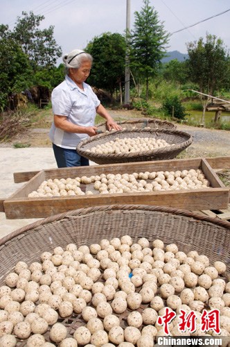 江西德安尖山村, 这个山清水秀的宁静小村74年前被日寇蹂躏,伤亡惨重。图为幸存者付双娥在门前酿晒酒曲。 王昊阳 摄