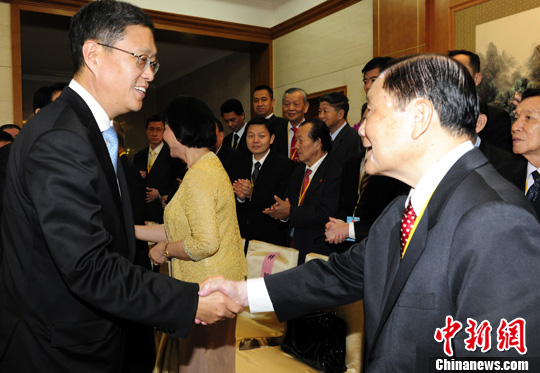 9月12日晚,中国国务院侨办副主任何亚非(左)在北京钓鱼台国宾馆会见了以卢祖荫为团长的菲律宾菲华各界联合会访华团一行。中新社发 张勤 摄