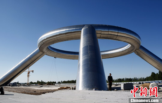 9月中旬,内蒙古鄂尔多斯市伊金霍洛旗的“零坐标”广场正在修建中,这里以“天圆地方”为设计概念,由一个圆环形雕塑和方形雕塑构成。中新社发 张浩 摄