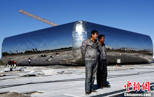 9月中旬,内蒙古鄂尔多斯市伊金霍洛旗的“零坐标”广场正在修建中,这里以“天圆地方”为设计概念,由一个圆环形雕塑和方形雕塑构成。中新社发 张浩 摄