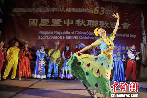 当地时间9月16日晚,南加州各界庆祝热烈庆祝中华人民共和国成立63周年国庆暨中秋联欢晚会在洛杉矶举行。身着民族服装的华人华侨代表载歌载舞庆祝节日。 中新社发 毛建军 摄