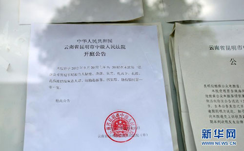 参与互动(0) 昆明市中级人民法院公告栏中张贴的湄公河“10·5”惨案开庭公告(9月17日摄)。新华社记者 王申 摄