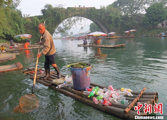 今年黄金周长假,广西阳朔县白沙镇遇龙村一些村民敢当“清道夫”,每天清晨,自觉清理“小漓江”遇龙河水面上漂浮的垃圾,营造了一个干净整洁的漂流环境,深受广大游客赞誉。中新社发 张立波 摄