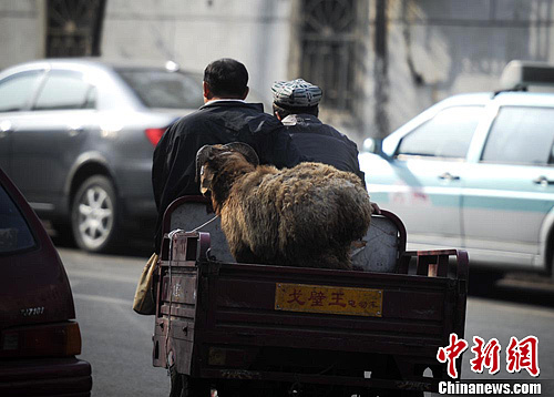 一大早,两位维吾尔族民众用电动车载着羊,准备回家宰牲过节。刘新 摄