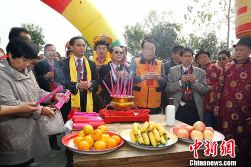 10月27日,河南固始,护送闽王銮驾回故里的两岸三地王氏宗亲800余人,绵延数里,闽王王审知金身千年首度回到故居——河南省固始县分水亭镇王塘村,来自海内外的王氏宗亲共同祭拜闽王金身。中新社发 王中举 摄