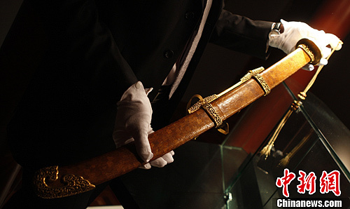 10月29日,在中国嘉德2012秋季拍卖会中,“清乾隆金桃皮鞘‘天字十七号’‘宝腾’腰刀”以4830万元高价成交。中新社发 杨可佳 摄