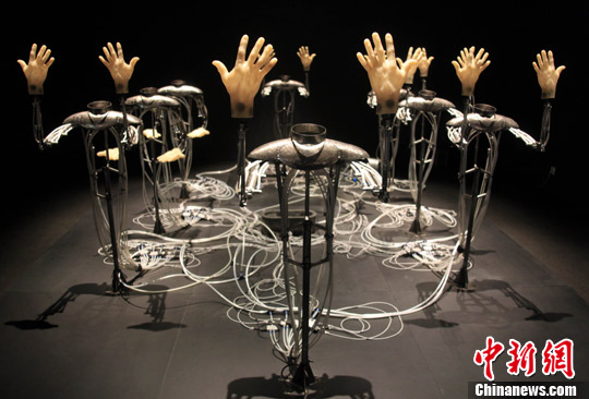 10月31日下午,由清华大学、中国科学技术馆主办的“第三届艺术与科学国际作品展”在北京举行媒体专场开放活动,图为英国参展的以混合材料制作的“恶性循环2012”艺术作品。中新社发 孙自法 摄