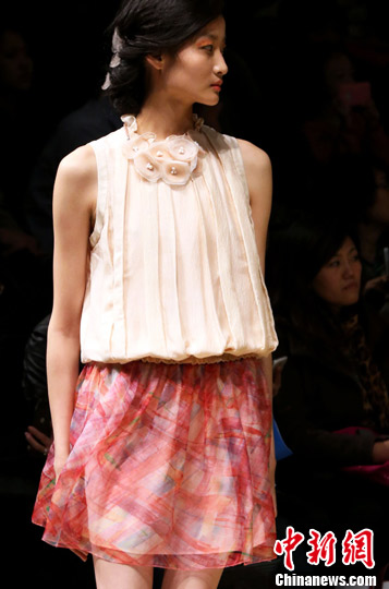 11月1日晚,中国国际时装周(2013春夏系列)举行“时尚新古典”赵卉洲作品发布会。图为模特展示赵卉洲发布会作品。中新社发 钱兴强 摄